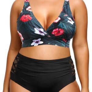 Bikini floreada arriba negra cruzada con transparencia abajo